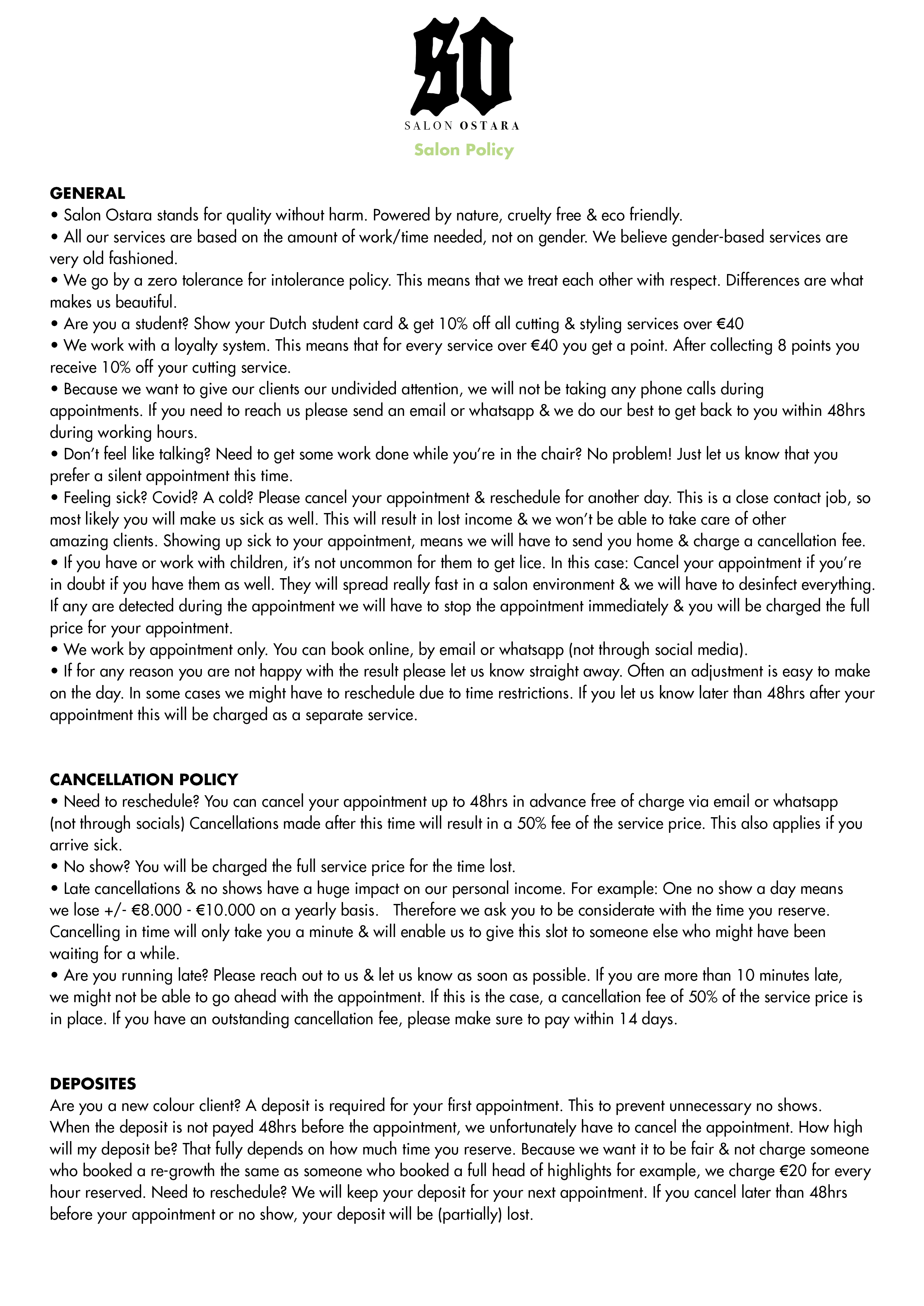 I work by appointment only, so openingtimes may vary per week. Sunday and Monday the salon is closed.